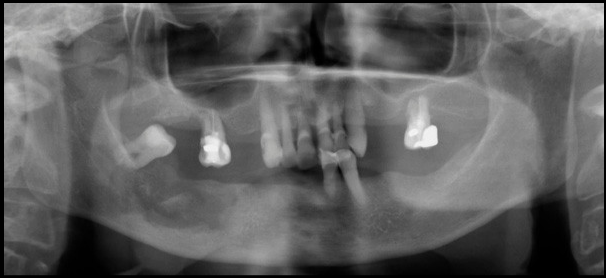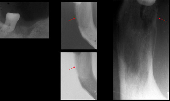 Paciente femenino 72 años de edad, acude a la consulta por presentar secresión purulenta en zona de extracción de pieza 4.6 realizada hace aproximadamente cuatro meses . En la radiografía panorámica se observa rarefacción ósea que compromete cuerpo mandibular del lado derecho con aumento de la densidad ósea circundante; en las radiografías intraorales apreciamos reacción periostal a nivel de la tabla ósea vestibular, así como la presencia de secuestro óseo hacia la tabla ósea lingual. Obsérves también la alteración en la morfología condilar bilateral compatible con proceso degenerativo articular (Osteoartrosis).