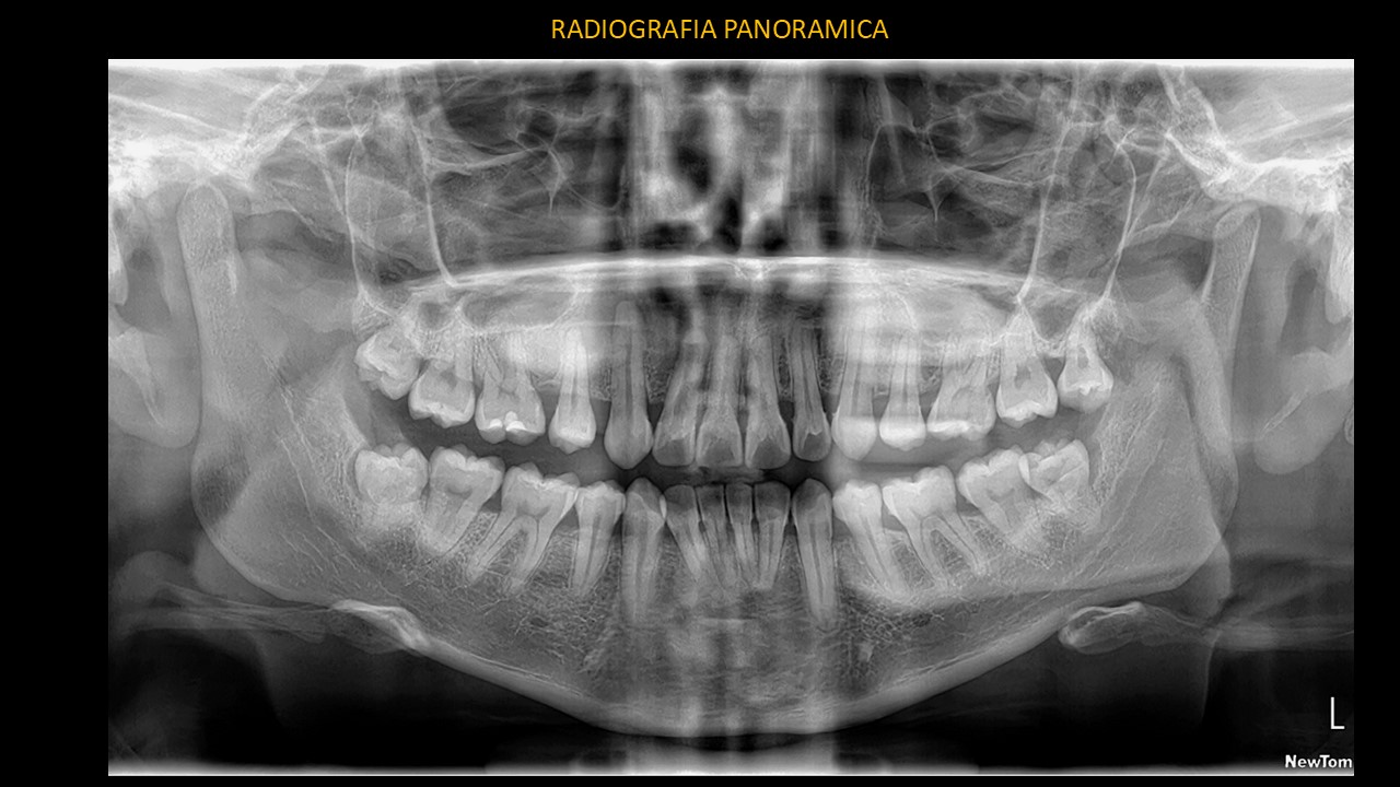 En la radiografía panorámica (Figura 1) se observa una imagen radiolúcida de forma irregular a nivel periapical de pieza 13 y una rarefacción radiolúcida proyectada en zona de pieza 12. En la pieza 13 se observa hipercementosis a nivel del tercio medio y apical y el ancho mesio-distal del conducto radicular de pieza 12 se encuentra aumentado. Además, se observa las piezas 38 y 48 semi incluidas con una imagen radiolúcida para coronaria compatible con probable lesión quística en formación (Quiste Paradental).