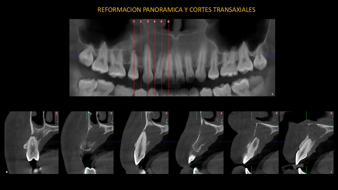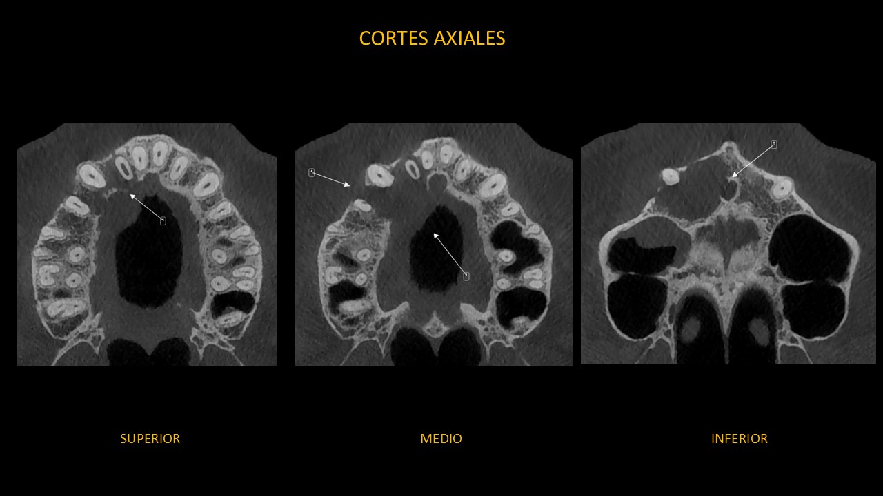 En cortes axiales (Figura 2), se observa una lesión osteolìtica de gran tamaño de limites definidos, bordes parcialmente corticalizados que se extiende desde mesial de pieza 14 hasta distal de pieza 11. Esta lesión se encuentra asociada a la pieza 12 y ocasiona la expansión, adelgazamiento y erosión de la cortical de tabla ósea vestibular, tabla ósea palatina y la cortical derecha del conducto naso palatino. Se observa aumento de volumen del tejido blando palatino a dicho nivel.