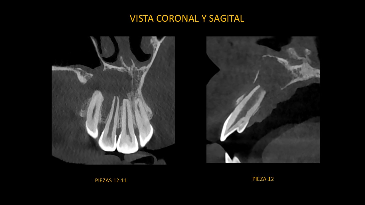 En los cortes sagital y coronal (Figura 3), se observa la extensión de la lesión desde el tercio medio apical de pieza 12 hasta el piso de fosa nasal derecha el cual adelgaza y erosiona, y compromiso de la cortical basal del seno maxilar derecho. Además, se observa alteración en la morfología dentaria de pieza 12 compatible con dens invaginatus.