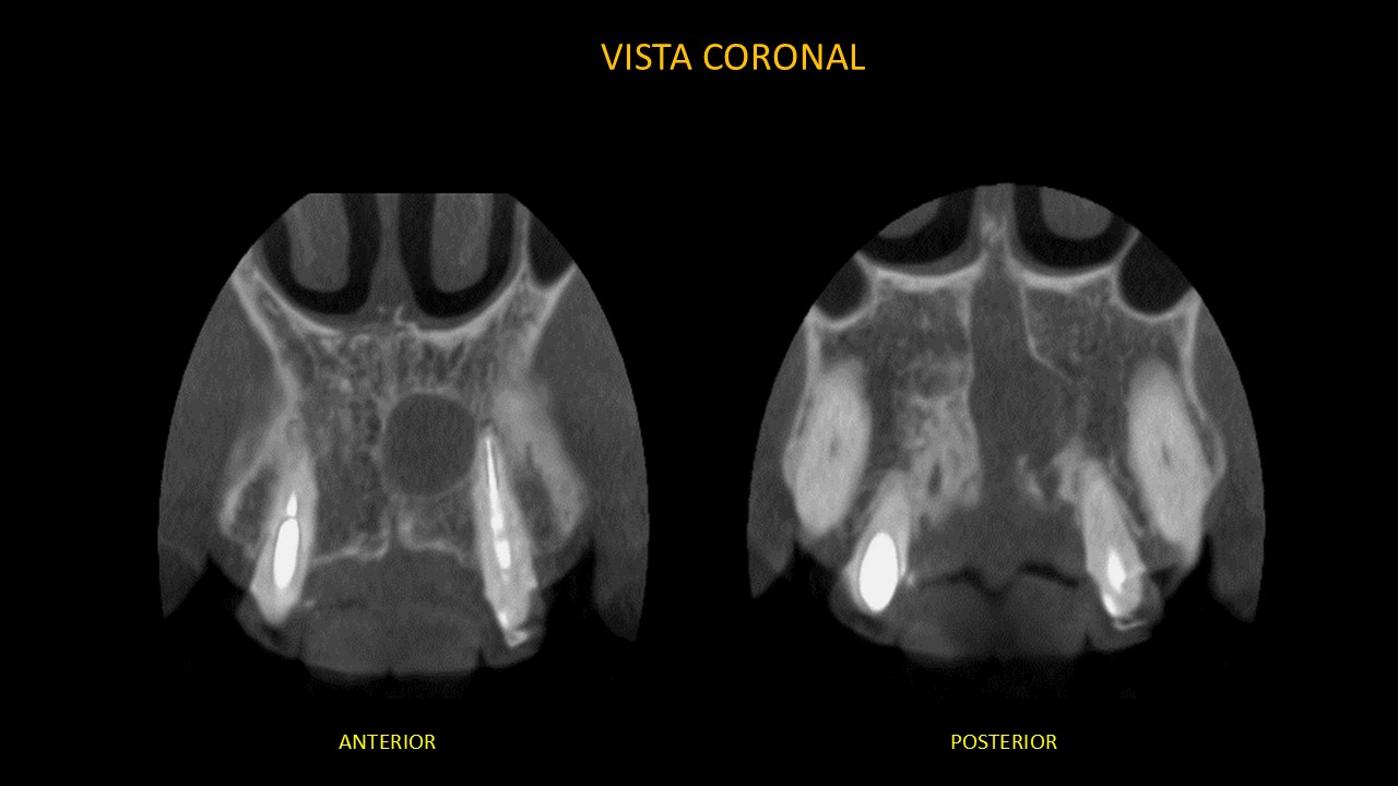 En la vista coronal (Figura 3) se observa una imagen isodensa en relación de contacto con el tercio apical mesial de la pieza 22, en una vista posterior se evidencia el aumento del diámetro mesio-distal del conducto nasopalatino.