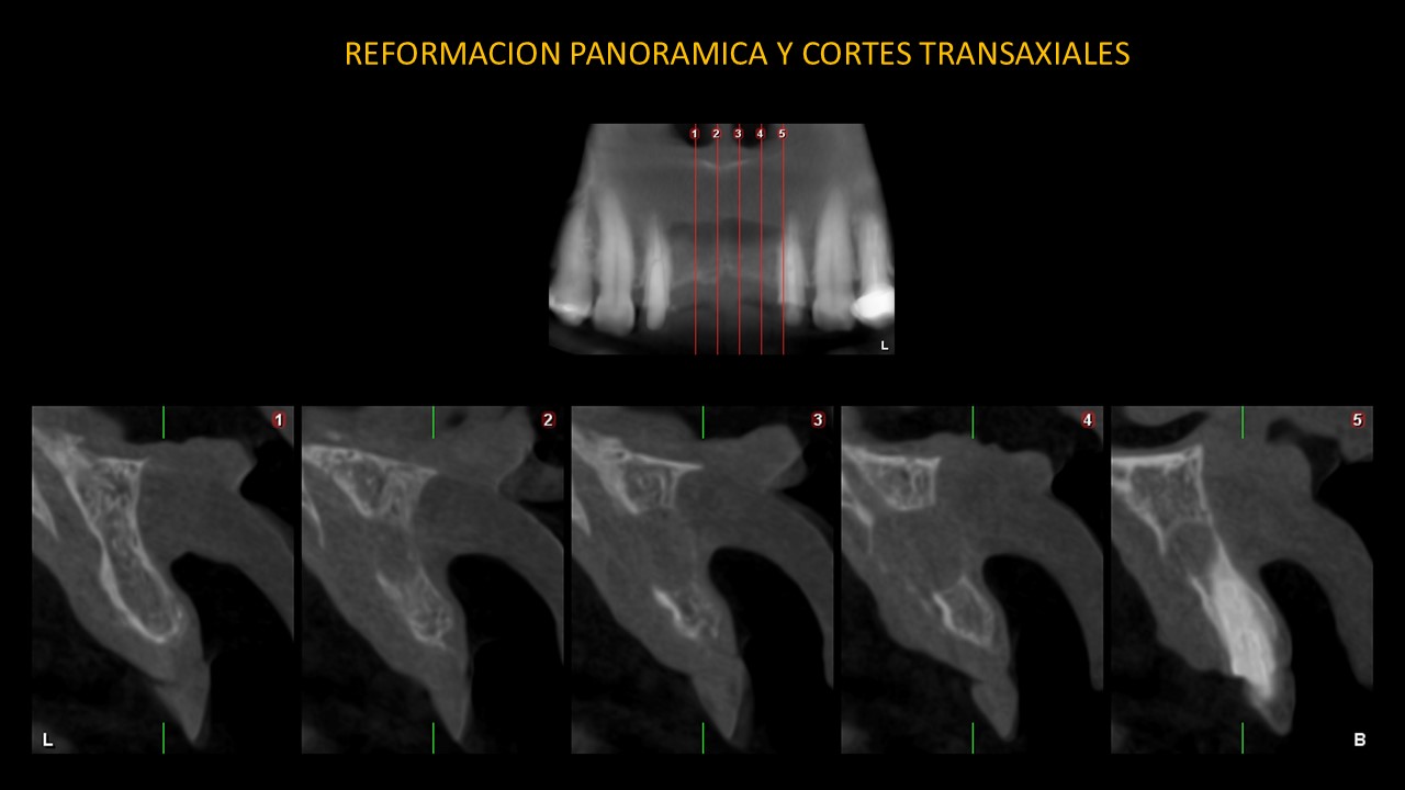 En las vistas transaxiales (Figura 4) podemos apreciar la extensión de la lesión, la expansión y adelgazamiento de la tabla ósea vestibular y palatina, además de la relación con el tercio apical mesial de la pieza 22.