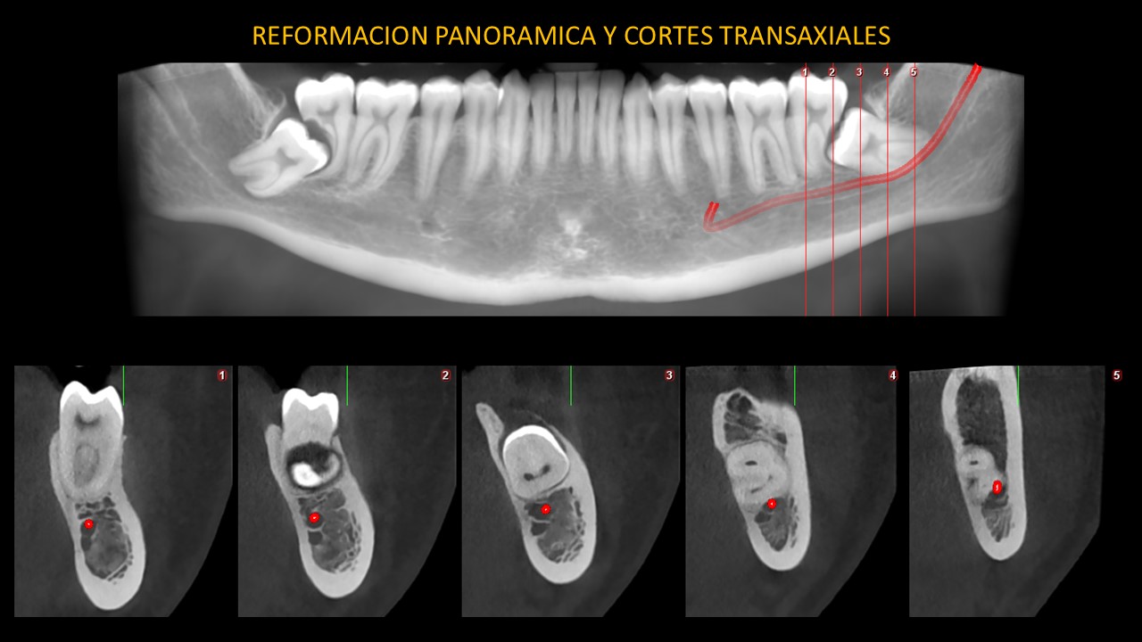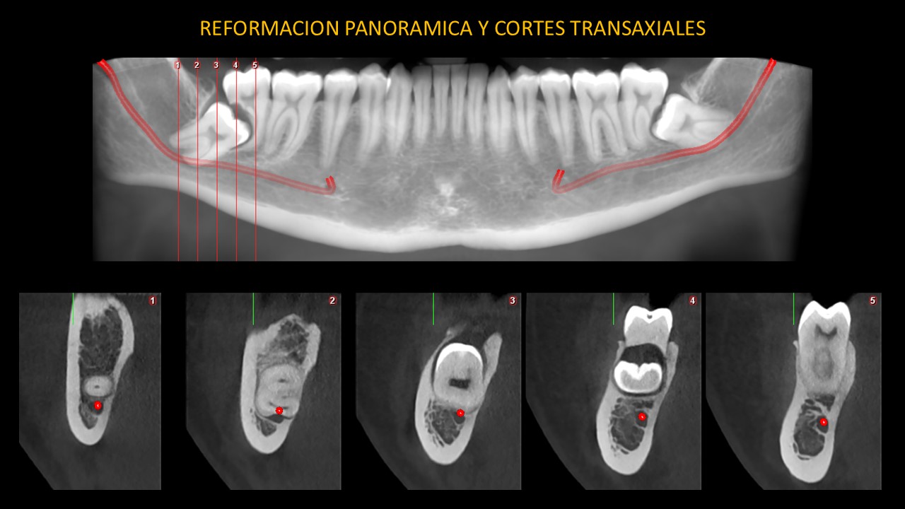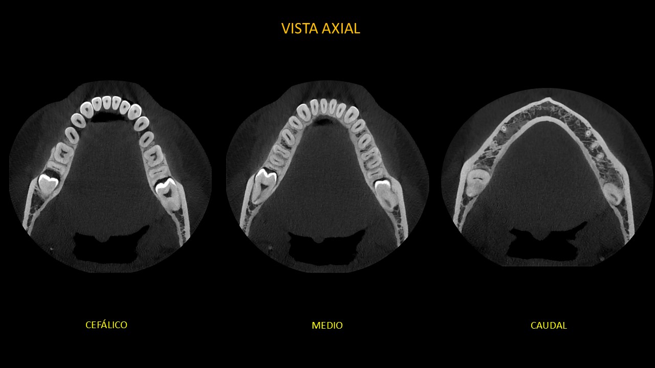 En cortes axiales (Figura 2), en sentido de cefálico a caudal, en la pieza 38 se observa el adelgazamiento parcial de la tabla ósea lingual y la relación de contacto de la corona con el tercio medio radicular y apical de pieza 37, ocasionando su reabsorción radicular externa. En zona de pieza 48, se observa el adelgazamiento parcial de ambas tablas óseas y la relación de contacto de la corona con el tercio cervical, medio y apical de pieza 47, ocasionando su reabsorción radicular externa.
