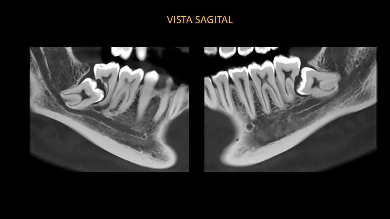 En las vistas sagitales (Figura 3), evidenciamos la extensión de corona de pieza 38 hacia distal de pieza 37, en correlación con imagen hipodensa peri coronaria, se extiende hacia el reborde alveolar y cortical superior del conducto dentario inferior. Se observa la corona de pieza 48 hacia distal de pieza 47, en correlación con imagen hipodensa peri coronaria, se extiende hacia el reborde alveolar y tercio medio – apical de pieza 47.