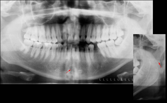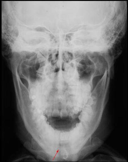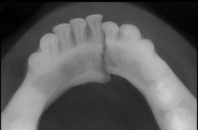 Paciente de 32 años acude a la consulta radiológica post accidente automovilístico por presentar múltiples contusiones. Al examen extraoral el paciente refiere dolor a la palpación de la región mentoniana, asi como de la zona geniana del lado izquierdo, presentando limitación a la apertura. En la radiografía panorámica (fig.1) podemos observar un trazo de fractura de forma vertical localizada en la sinfisis mentoniana que va desde el reborde alveolar hasta la basal mandibular, ademas de una linea radiolúcida de forma oblicua localizada a nivel subcondilar del lado izquierdo. En la radiografía posteroanterior tipo Towne (fig.2) nótese un desplazamiento hacia medial del cóndilo mandibular del lado izquierdo, y en la radiografía oclusal (fig.3) confirmamos el trazo de fractura en la sinfisis mentoniana con desplazamiento de segmentos.