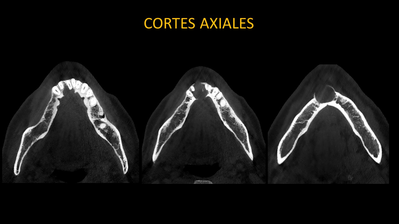 En los cortes axiales (Figura 2) y sagitales (Figura 3) podemos observar que la lesión es isodensa y genera el adelgazamiento y expansión de las tablas óseas lingual y vestibular.