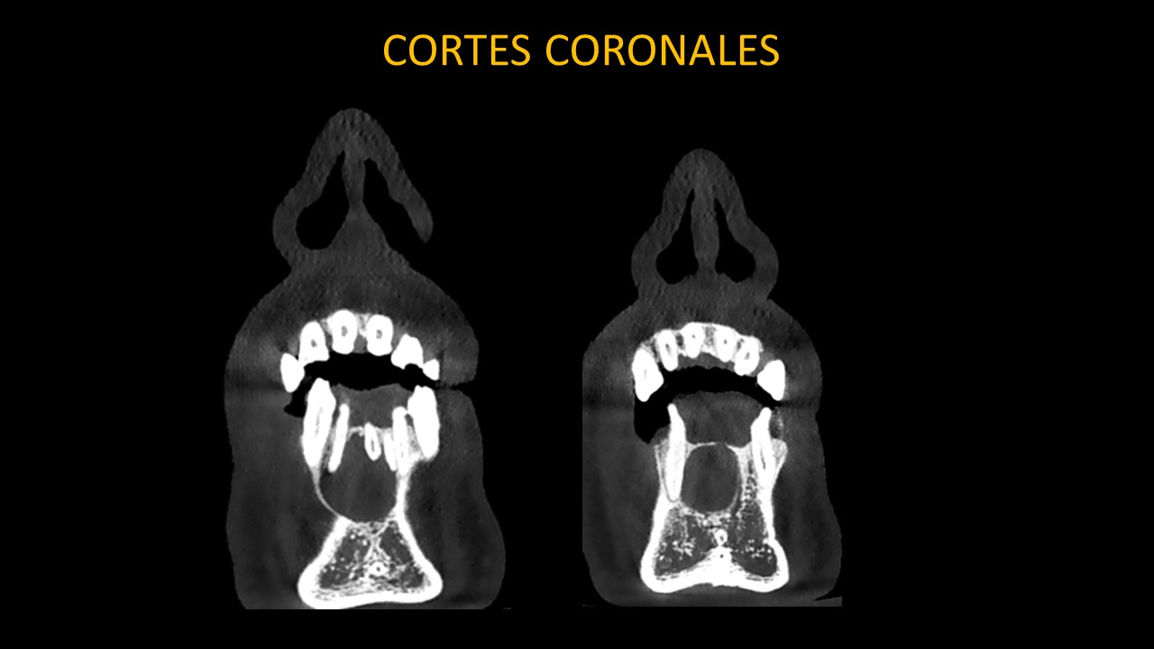 En los cortes coronales(Figura 4) se observa que está localizada entre las piezas 32- 43 y que genera el adelgazamiento de la cima del reborde alveolar junto con la pérdida de lámina dura a nivel del tercio medio radicular medio y apical de piezas 32,31,41 y 42.
