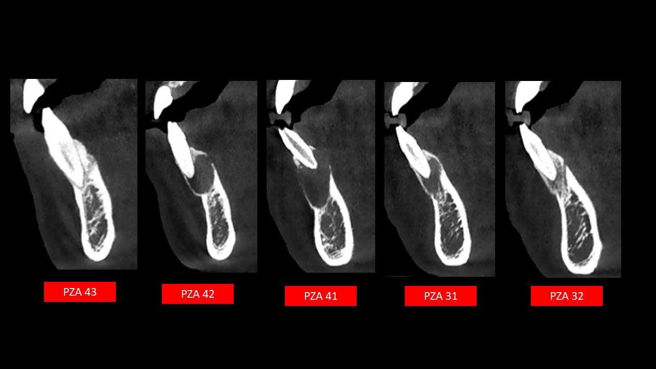 Siguiendo el eje de las piezas (Figura 6) , se observa atrición incisal con compromiso pulpar en la pieza 41, evidenciando un aumento del ancho del conducto radicular y una irregularidad a nivel del tercio apical lingual, lo que indicaría que el origen de la lesión estaría asociado a dicha pieza.