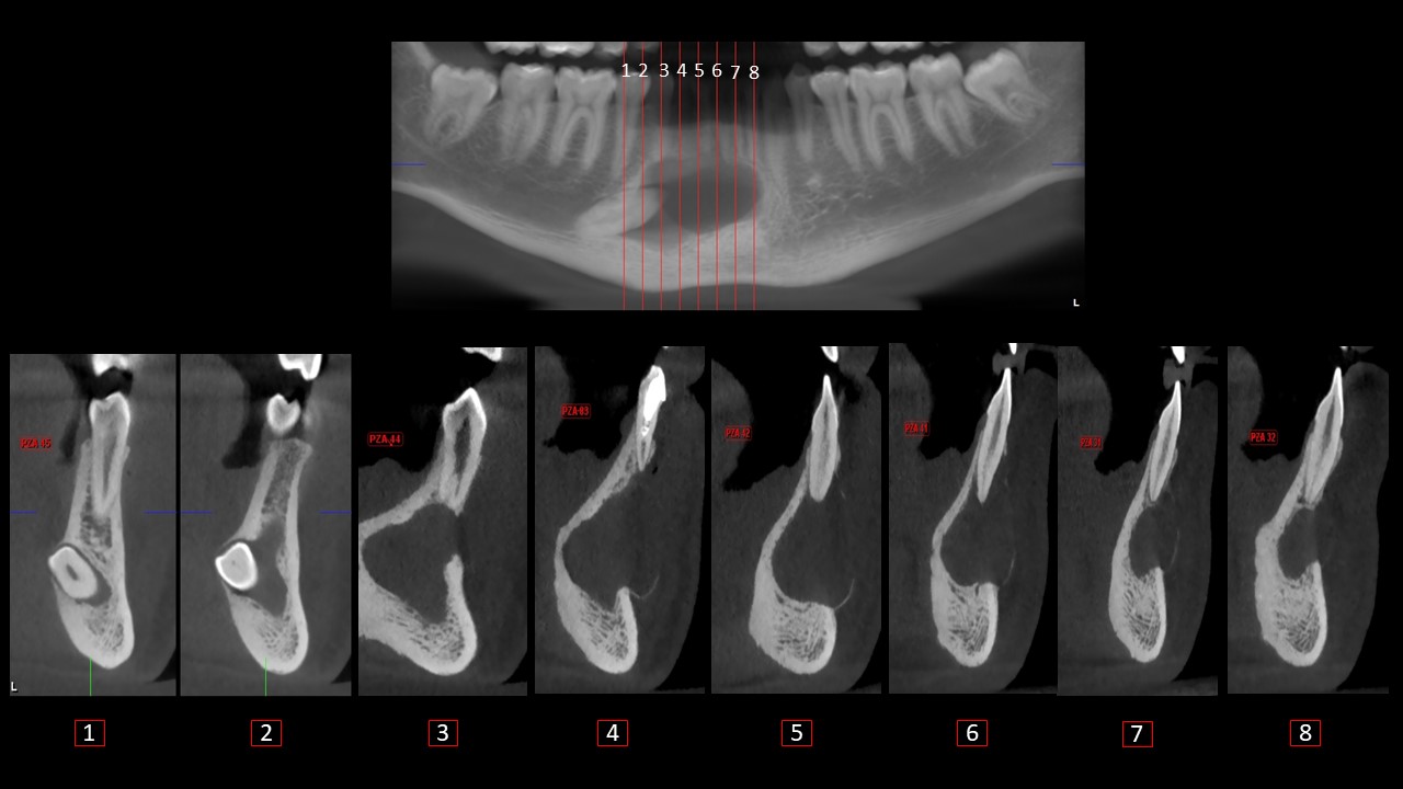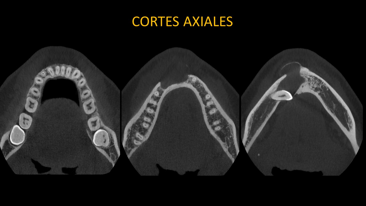 En los cortes transaxiales, observamos que la lesión genera el adelgazamiento y probable borramiento de la lámina dura a nivel del tercio apical de las piezas 32,31,41,42,83 y 44. Tiene un tamaño de 24.10mm (mesial-distal) x 21.43mm (vestibular-lingual) x 18.5mm (cefálico-caudal).