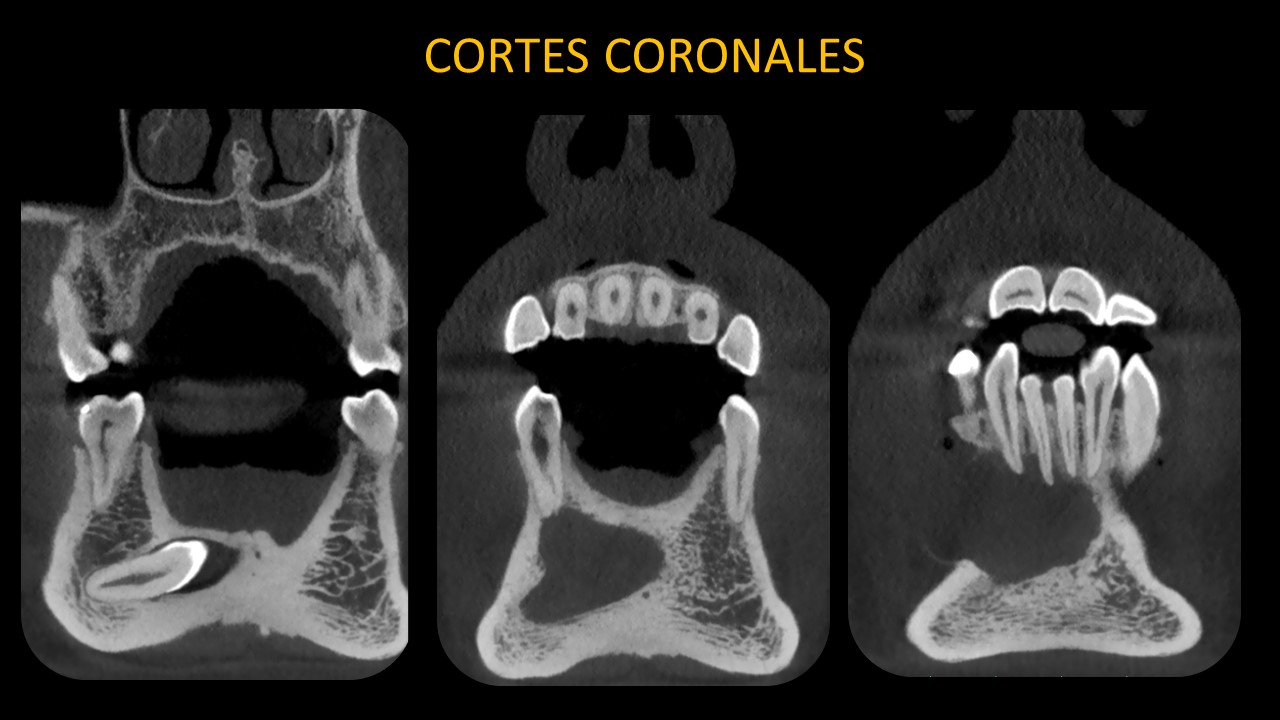En los cortes axiales observamos que es una imagen isodensa pericoronaria a la pieza 43 con extensión radicular, que genera el adelgazamiento y expansión de la tabla ósea vestibular de la región sinfisiaria; además, la pieza 43 se encuentra desplazada hacia la tabla ósea lingual, generando su adelgazamiento y expansión.